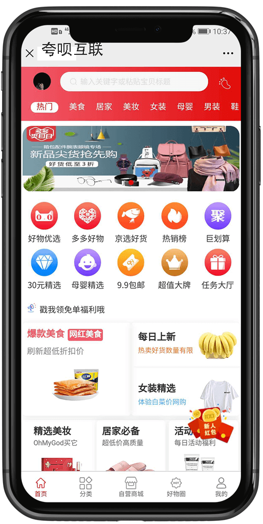 1、从APP内栏目或商品分类里挑选商品下单,如:9.9包邮、淘抢购、母婴等;
